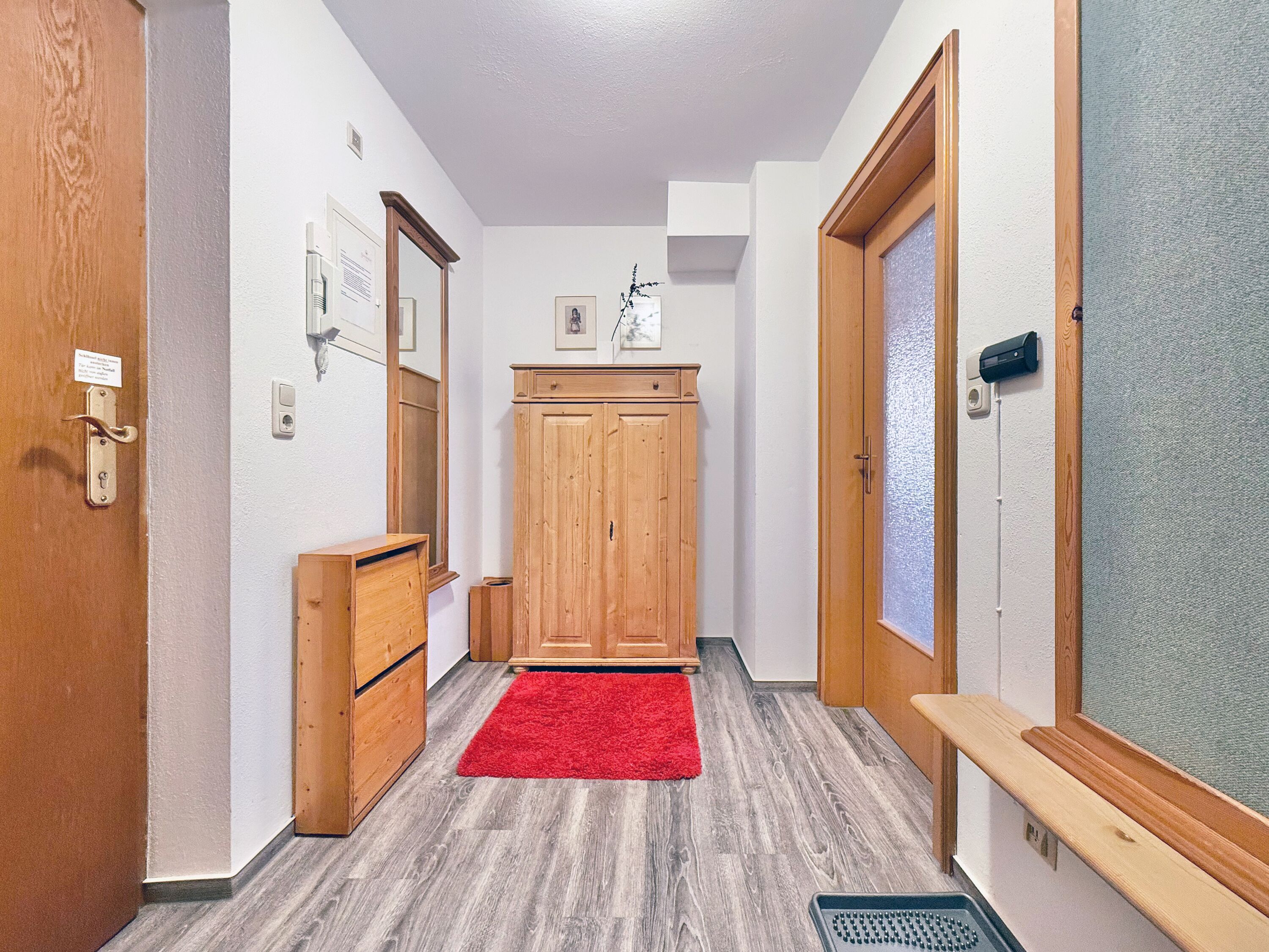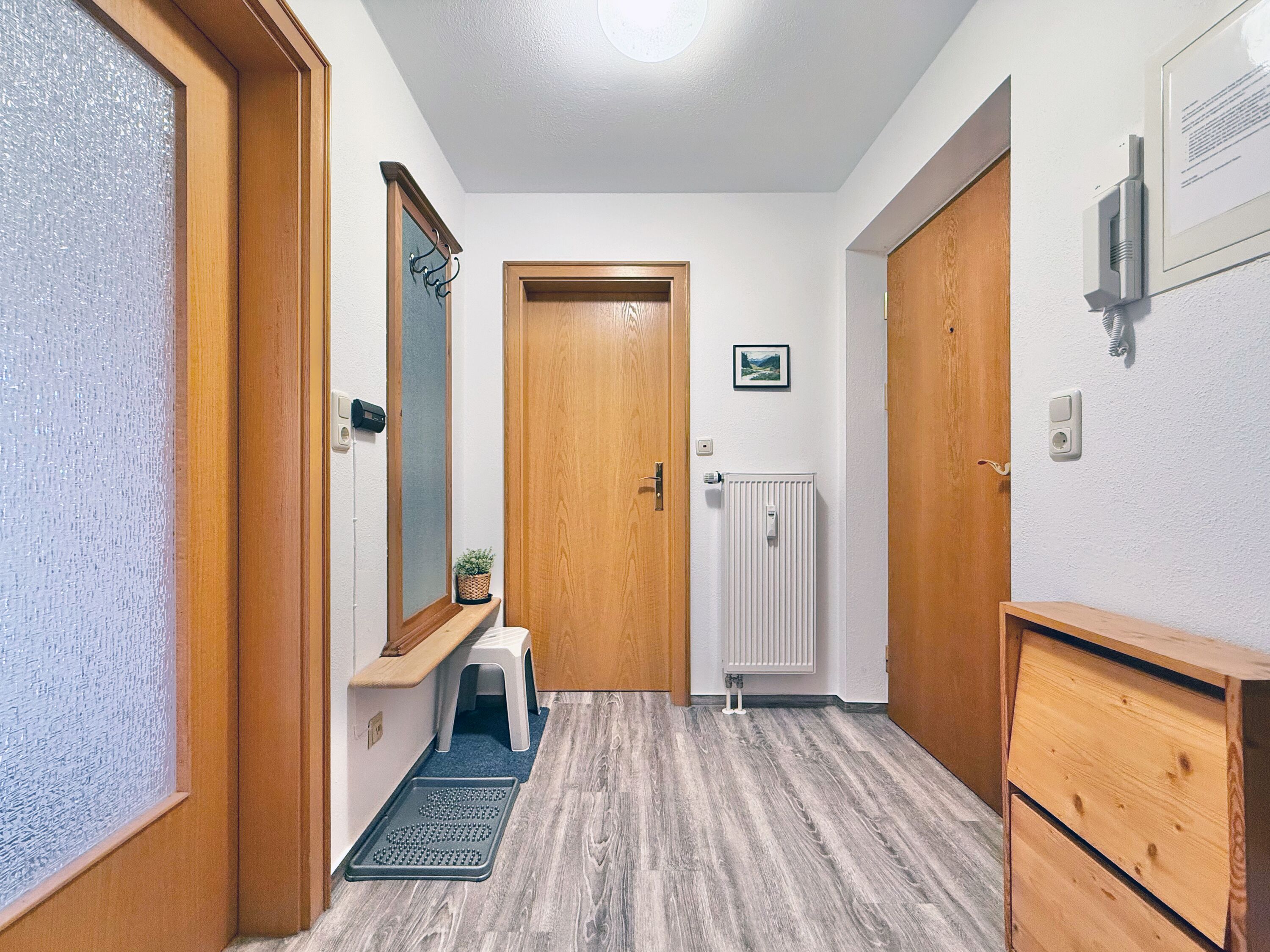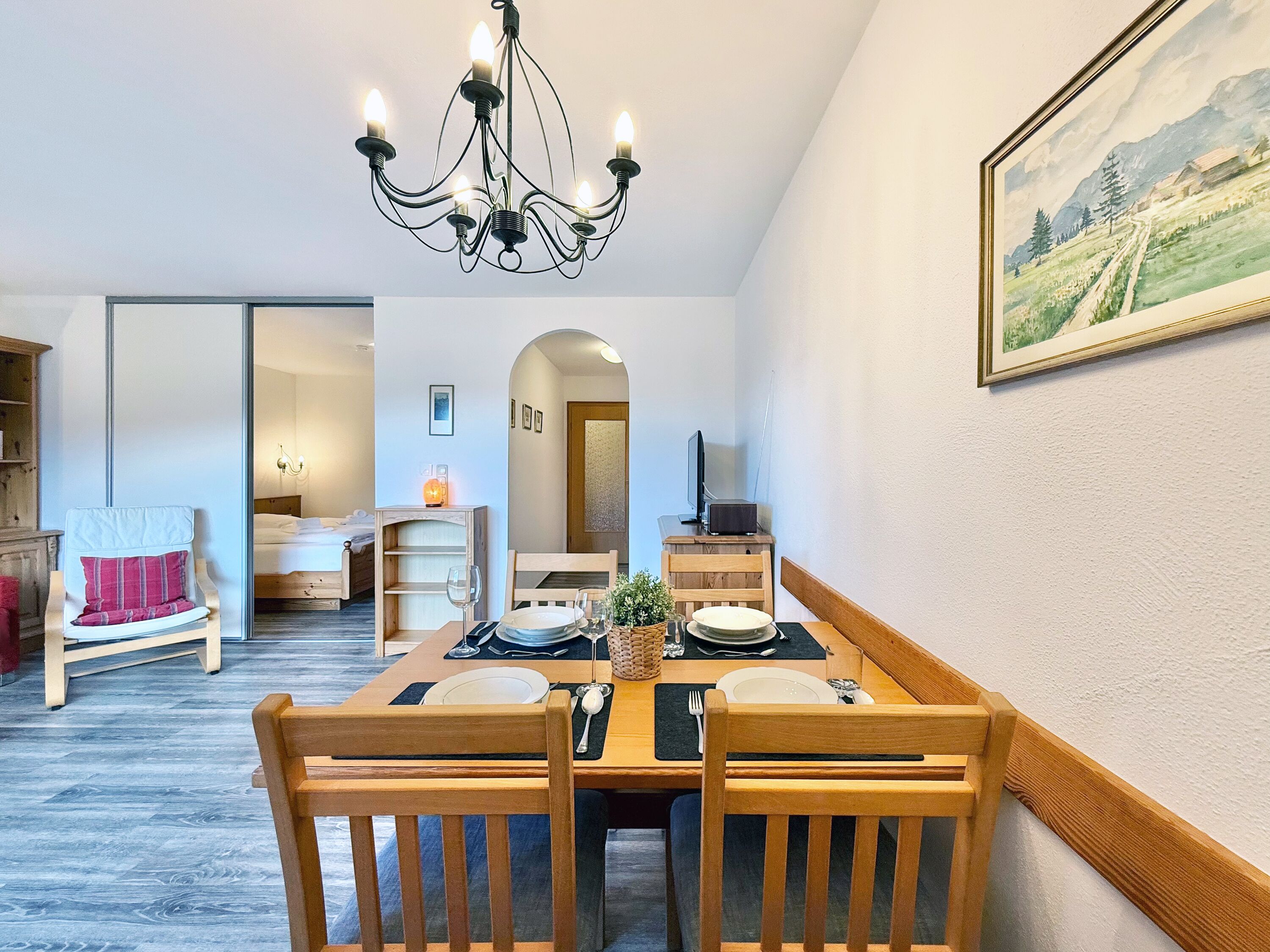 Die Ferienwohnung befindet sich im 1. Obergeschoss und verfügt über ein gemütliches Schlafzimmer, einen einladenden Wohnbereich sowie ein Badezimmer. Ein komfortables Doppelbett und ein Schlafsofa sorgen für angenehmen Schlafkomfort. Vom Balkon oder der Terrasse genießen Sie die herrliche Ruhe und den Blick auf die umliegende Berglandschaft.
