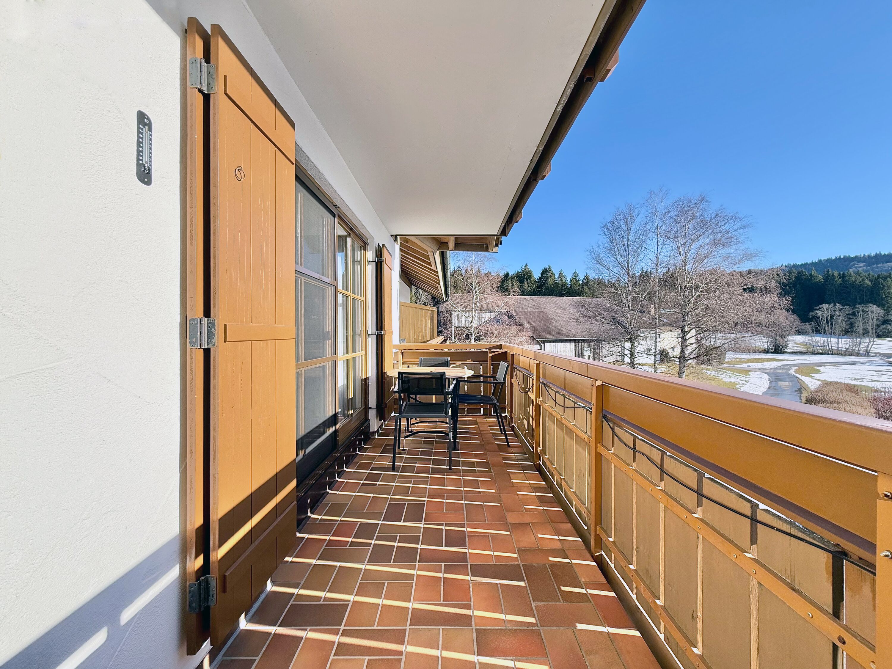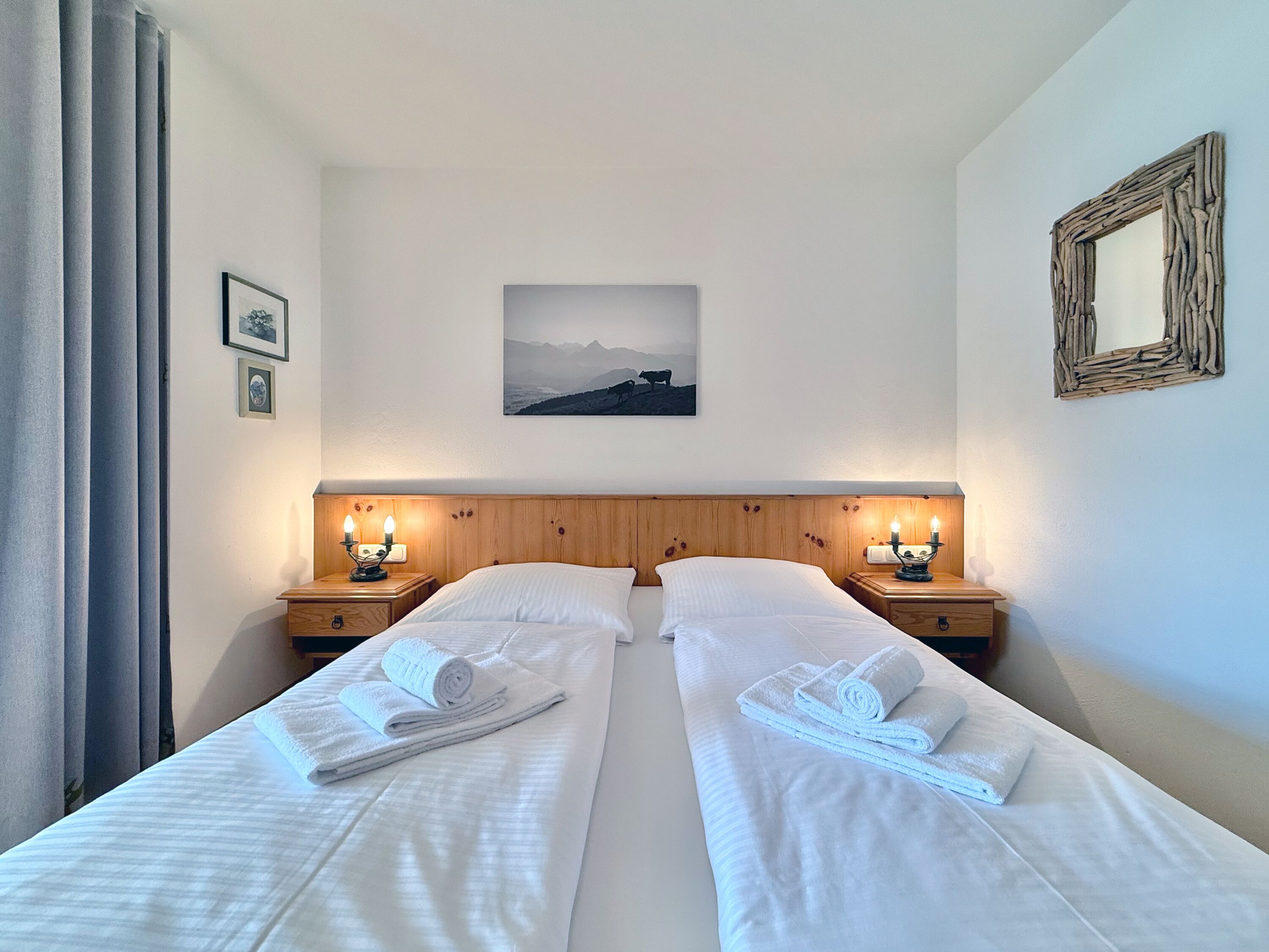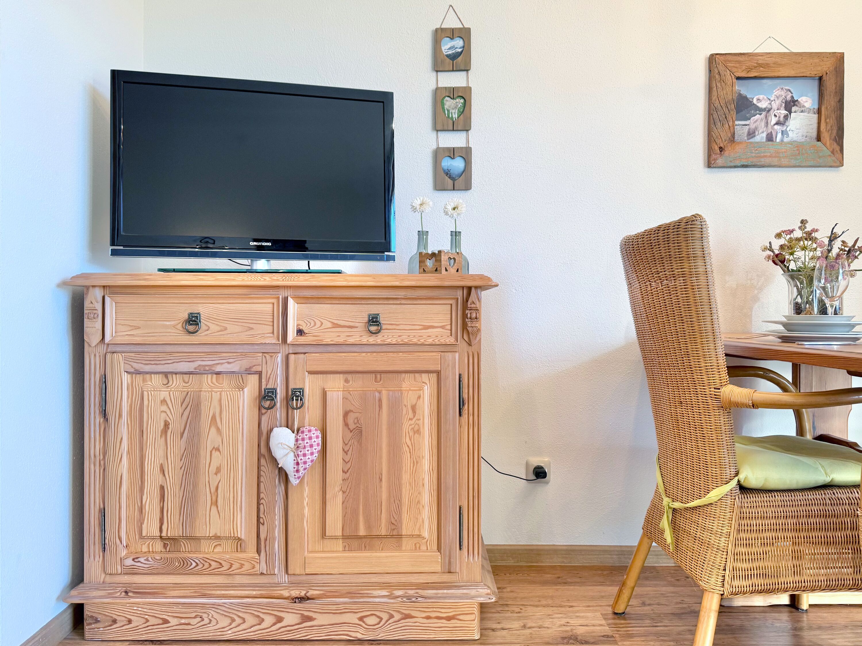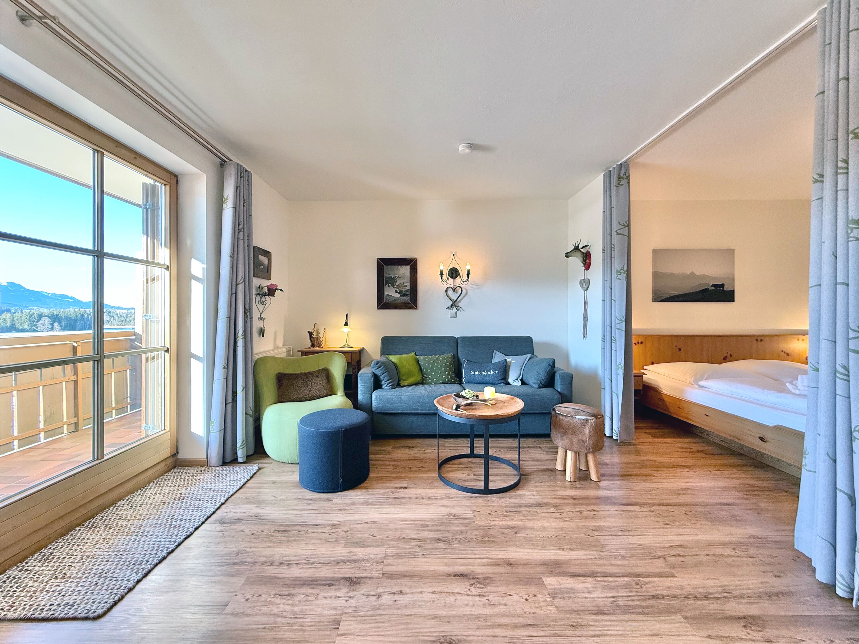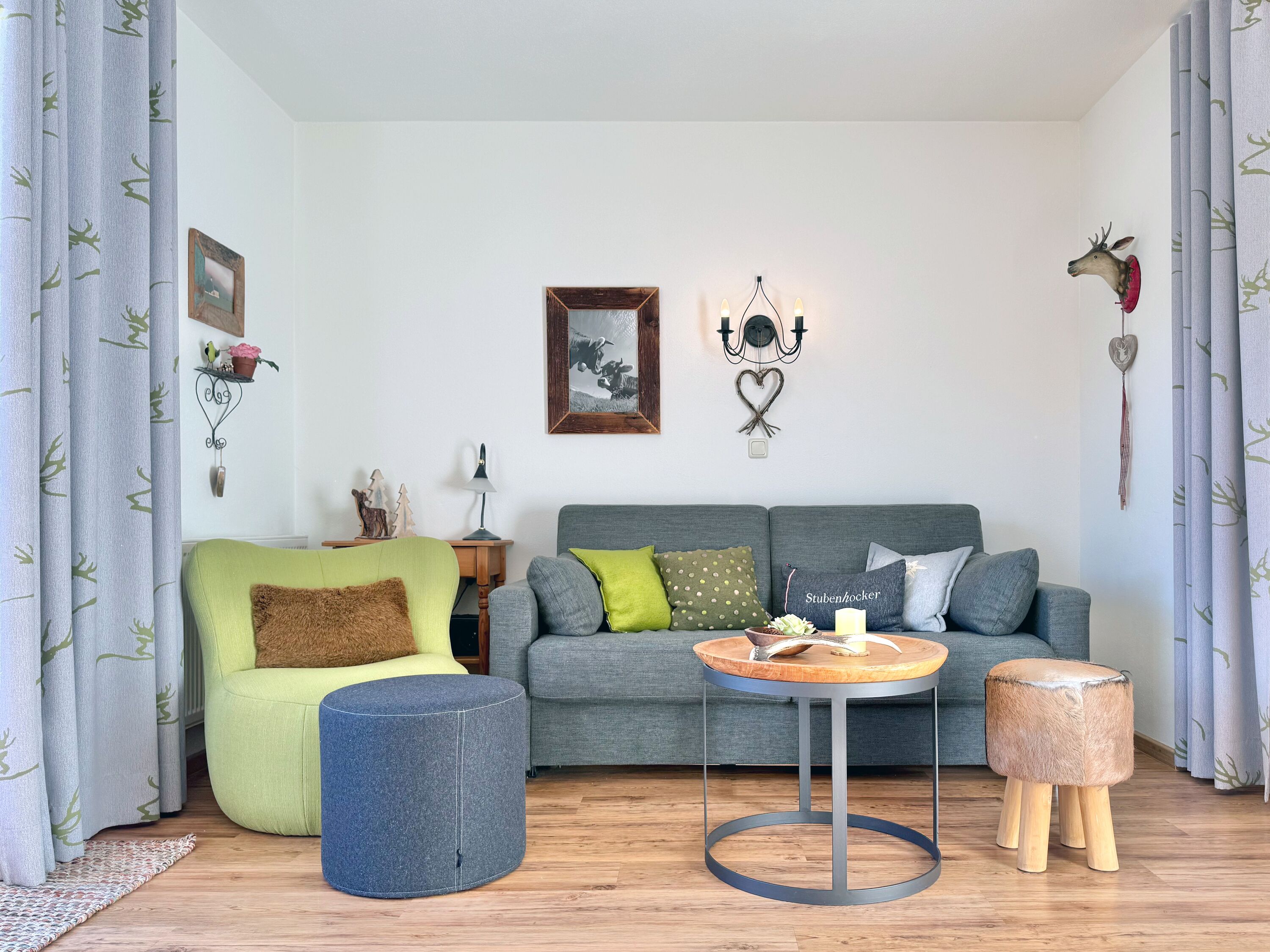 Die Ferienwohnung befindet sich im 1. Obergeschoss und verfügt über ein Schlafzimmer, einen gemütlichen Wohnbereich sowie ein Badezimmer mit Dusche und Toilette. Ein komfortables Doppelbett und ein Schlafsofa bieten angenehmen Schlafkomfort für zwei Erwachsene und ein Kind. Helle Räume, eine harmonische Einrichtung und liebevoll ausgewählte Details schaffen eine wohnliche Atmosphäre, in der man sich sofort zuhause fühlt. Vom Balkon genießen Sie einen schönen Blick auf die umliegenden Wiesen sowie Berge und Sie können den Abend gemütlich bei einem Sonnenuntergang ausklingen lassen.