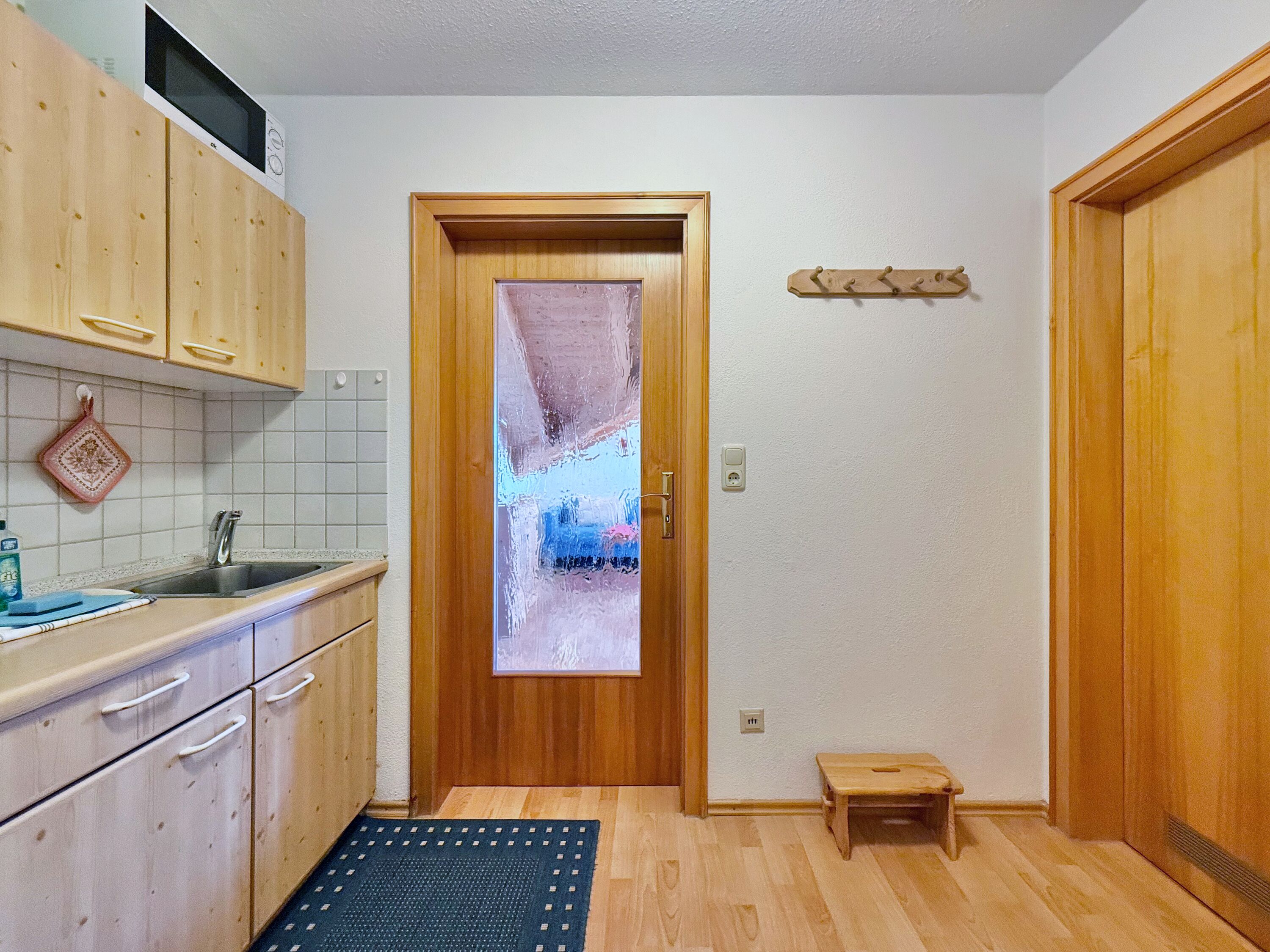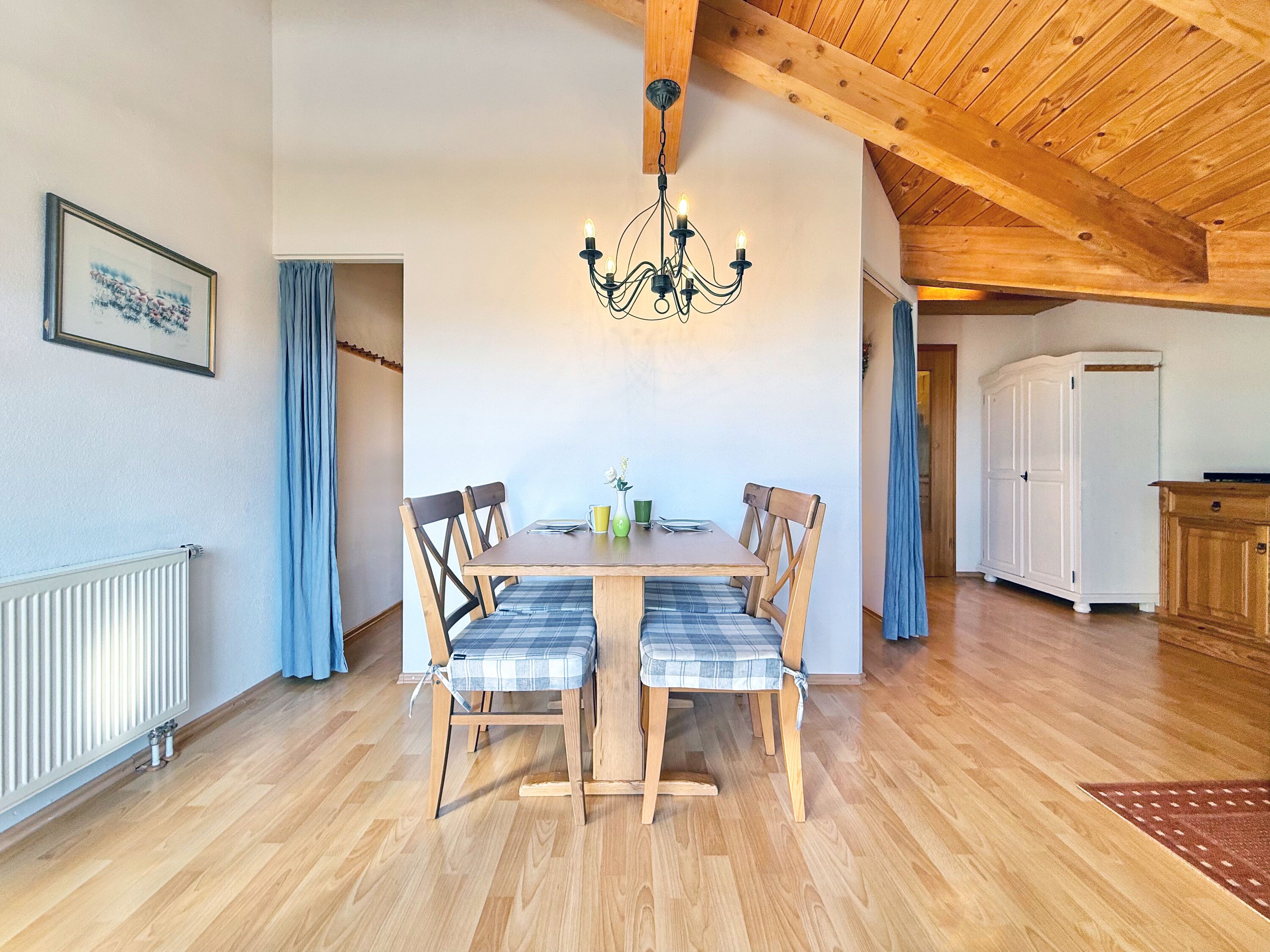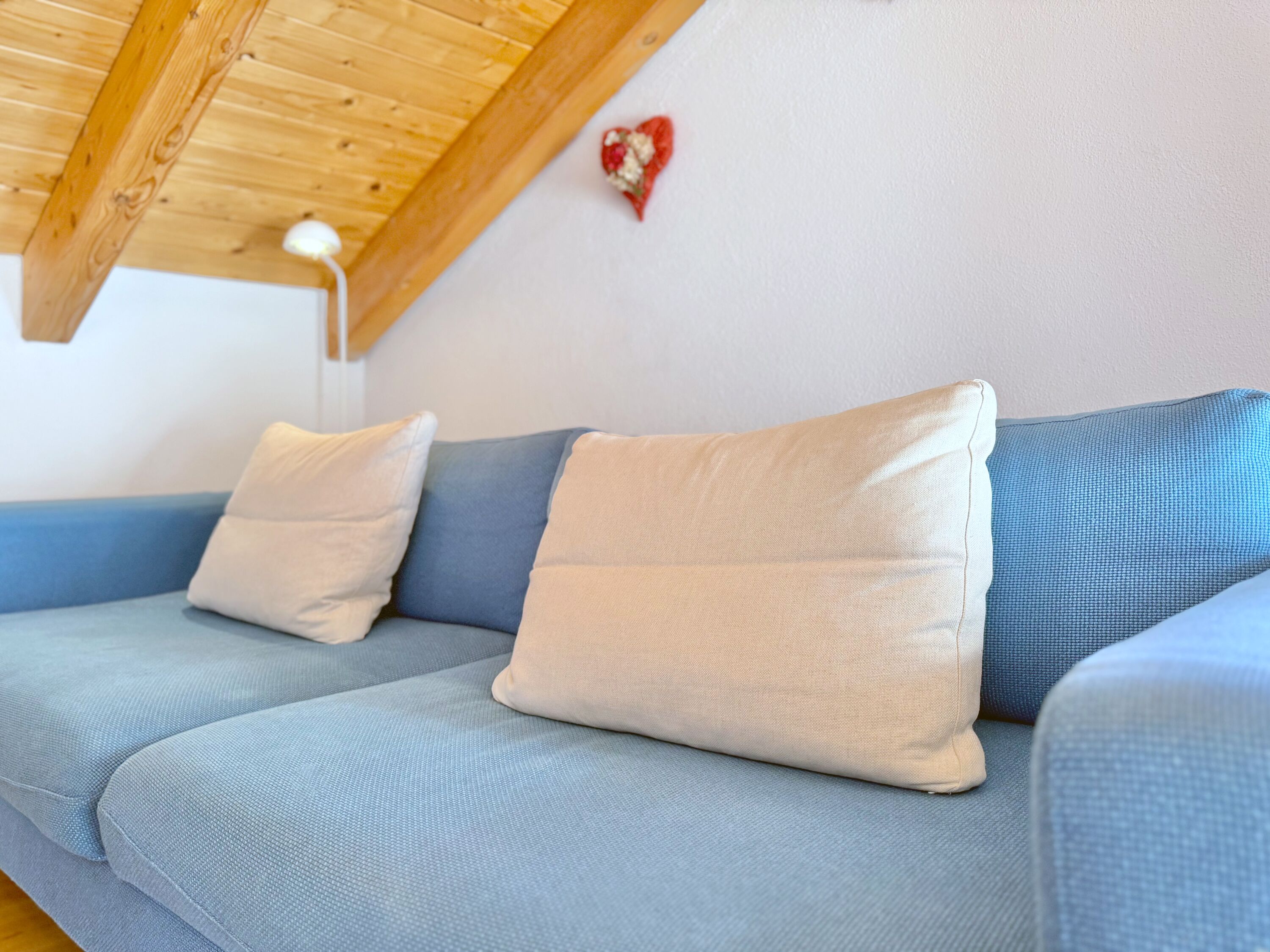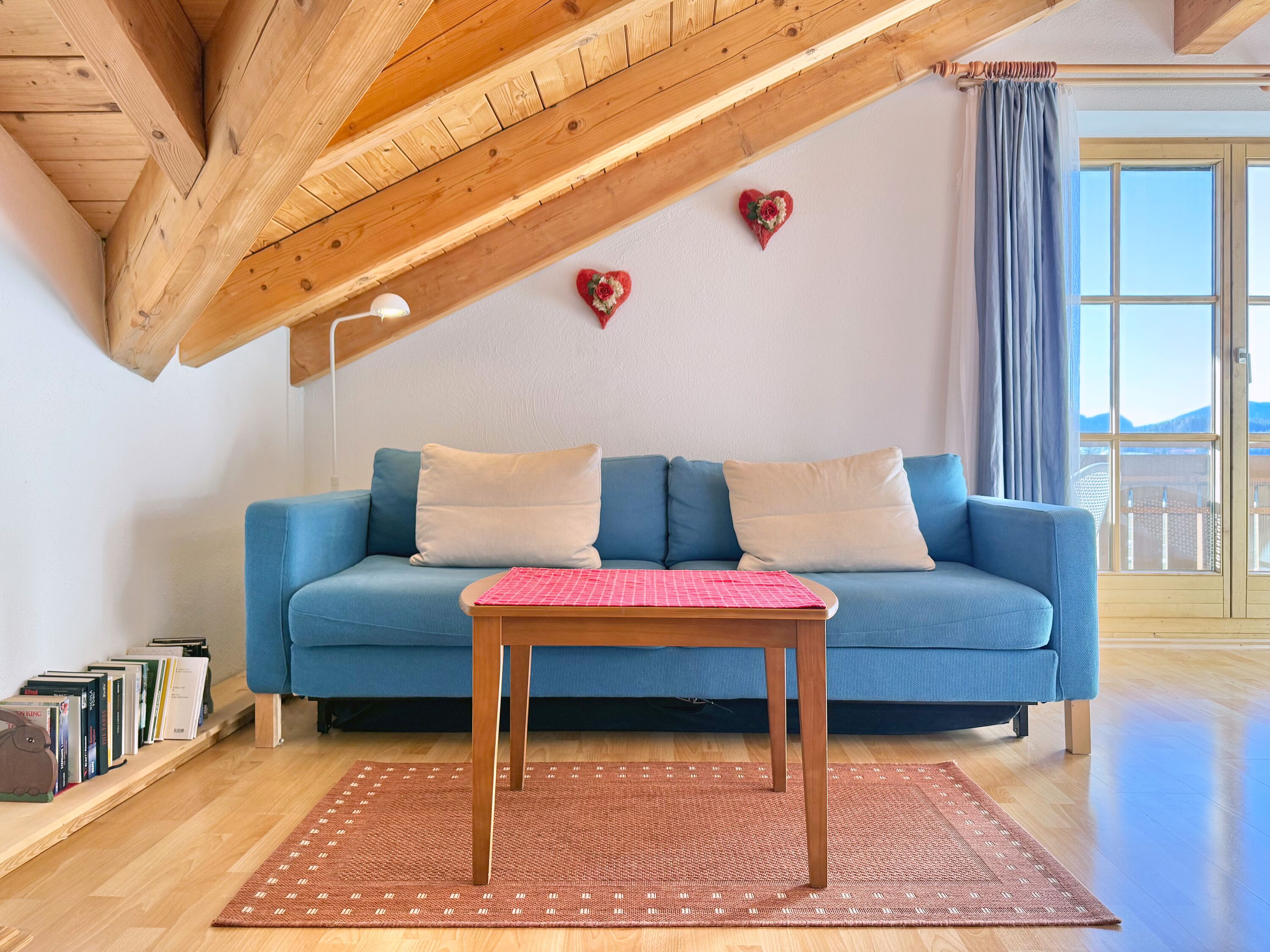 Die Ferienwohnung befindet sich im 2. Obergeschoss des Hauses. Vom Balkon aus genießen Sie den Sonnenuntergang sowie einen weiten Blick auf die umliegenden Berge. Der durchdachte Grundriss sorgt für ein besonderes Wohngefühl. Das Doppelbett befindet sich in einem separaten Bereich und bietet einen ruhigen Rückzugsort nach einem aktiven Tag in der Allgäuer Natur.